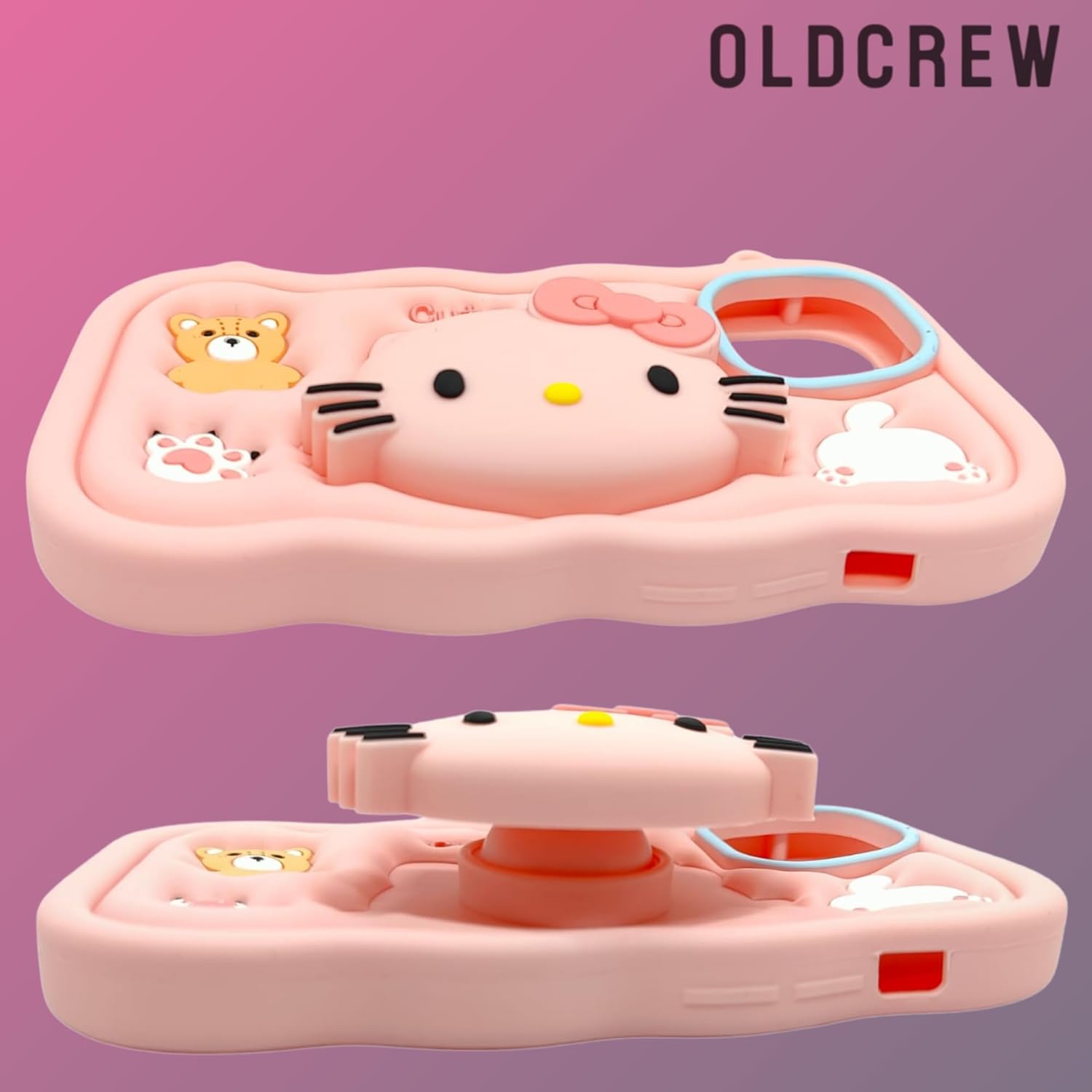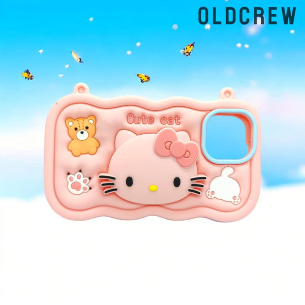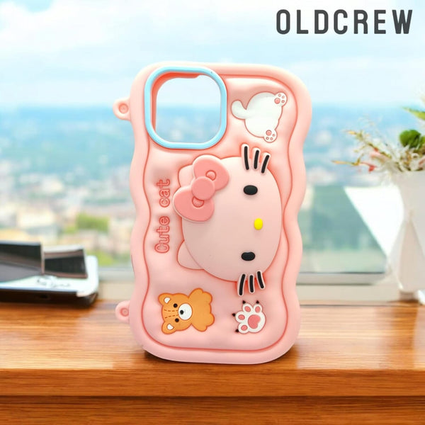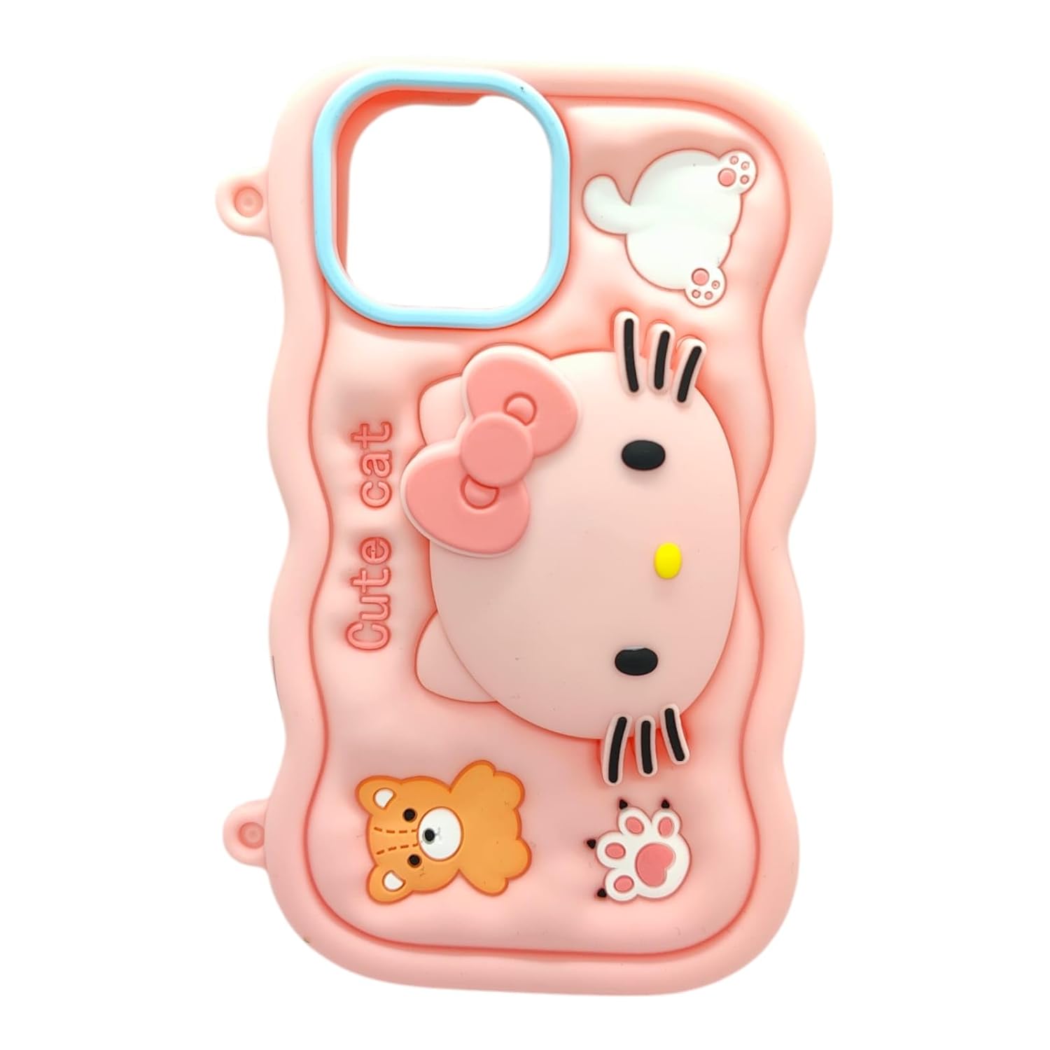 3D Silicone Cartoon Case for iPhone 15 for Girls, Kids, Women, Boys (Cute Cat Themed) with inbuilt Stand